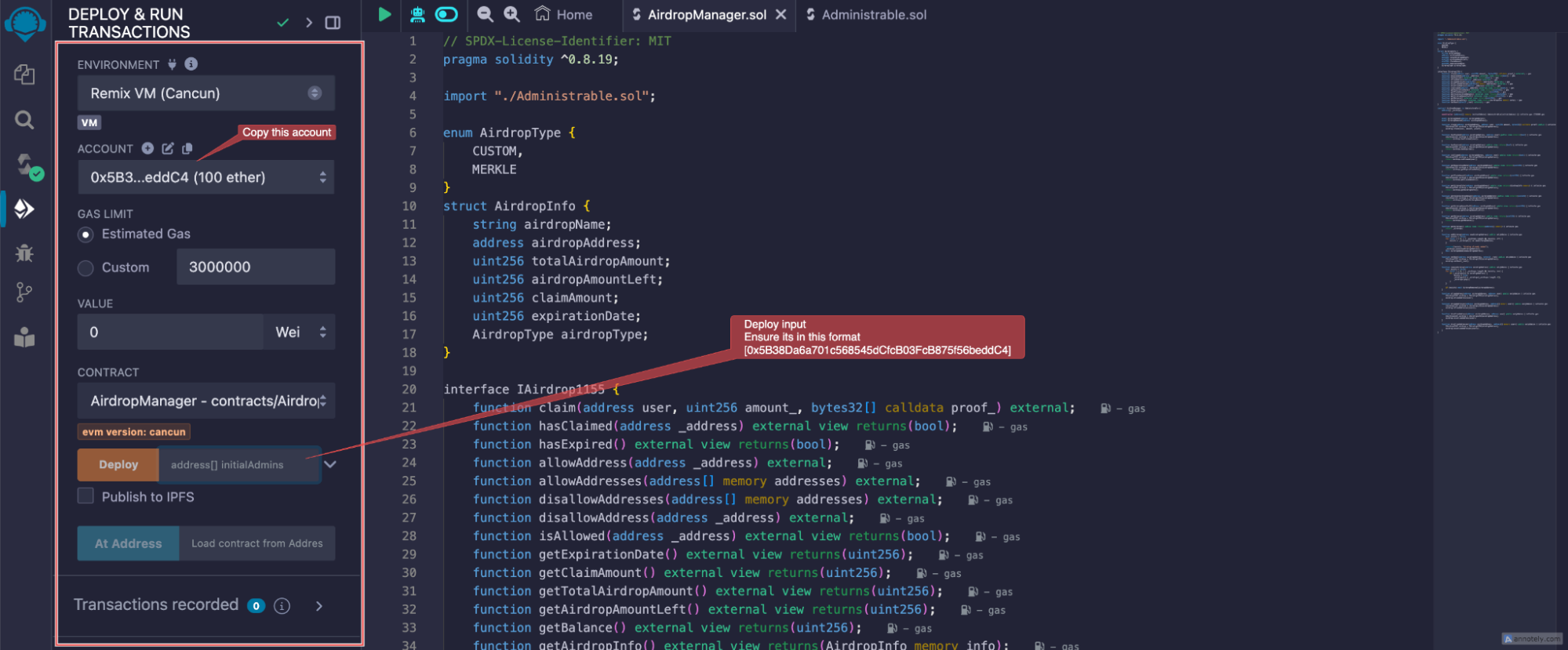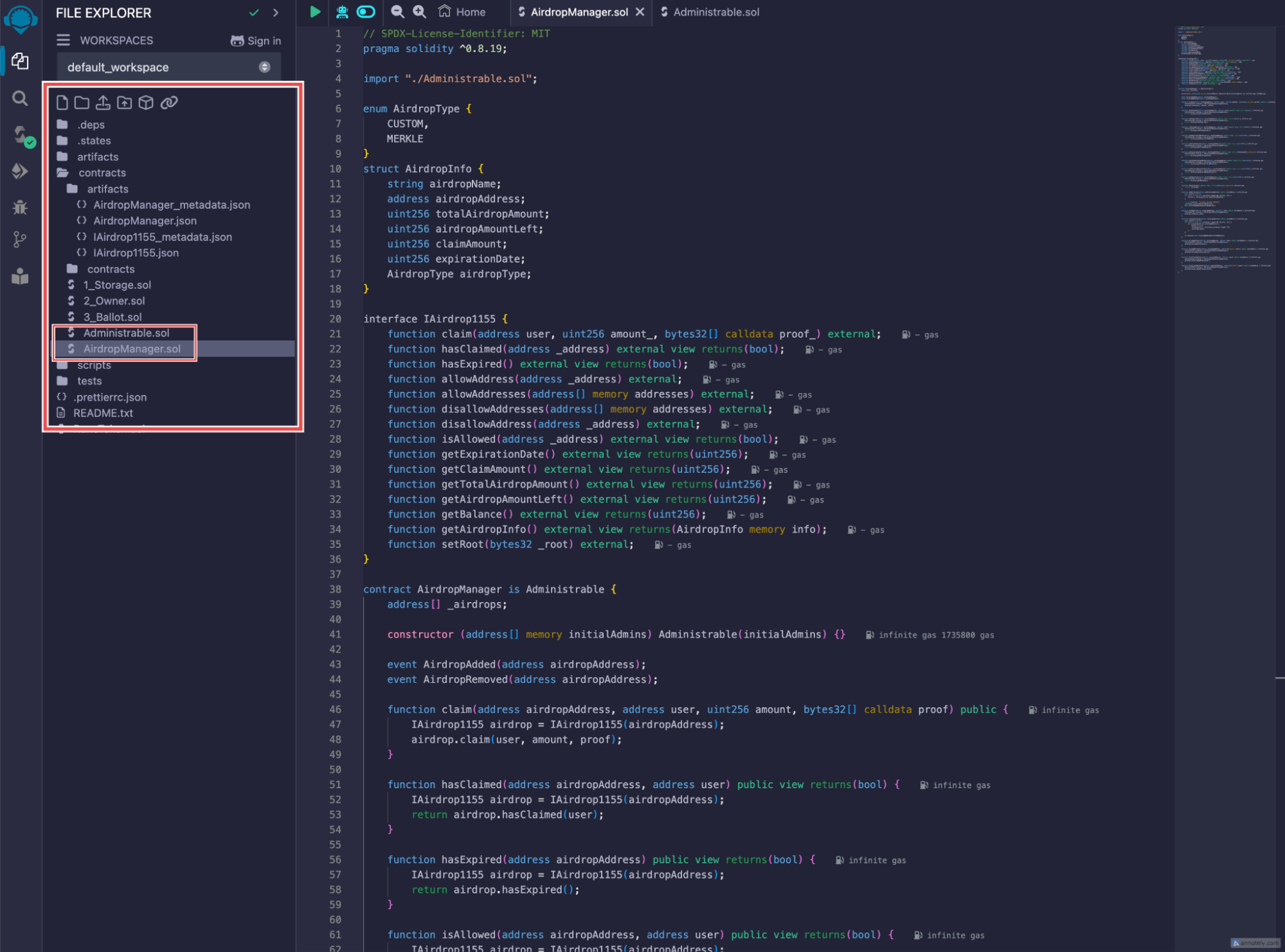 AirdropManager.solandAdministrable.solcontracts. These files are crucial because theAirdropManagercontract imports functions fromAdministrable.sol. - Paste the contents of both contracts into Remix IDE.